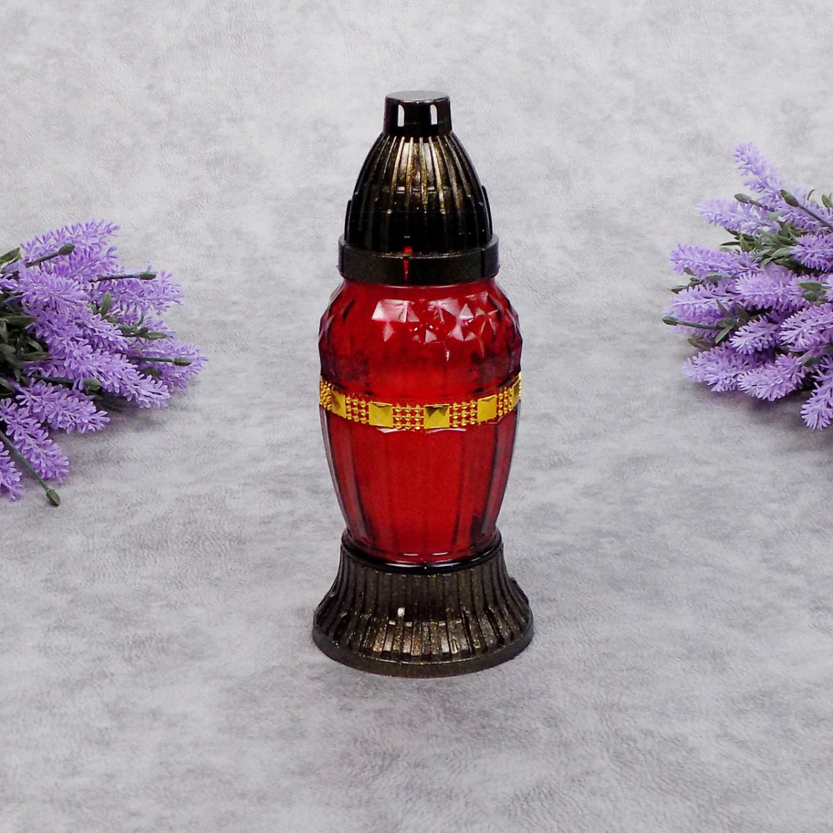 Лампадка зі свічкою-запаскою - виготовлена з високоякісних матеріалів, не містить токсичних речовин, не коптить і абсолютно безпечна для здоров“я. Матеріал: скло/пластик Час горіння свічки: ≈ 14 год Пакування: 12 шт Висота: 21 см Ширина: 9 см Глибина: 9 см Вага: 0,3 кг Призначено для використання: цвинтар, пам“ятні заходи та меморіали тільки зовнішнє використання простота у використанні, можливість зміни свічки без зміни лампадки може використовуватися як зі свічками, так і з лампами LED стійка основа забезпечує розміщення на різних поверхнях і мінімізує можливість перекидання