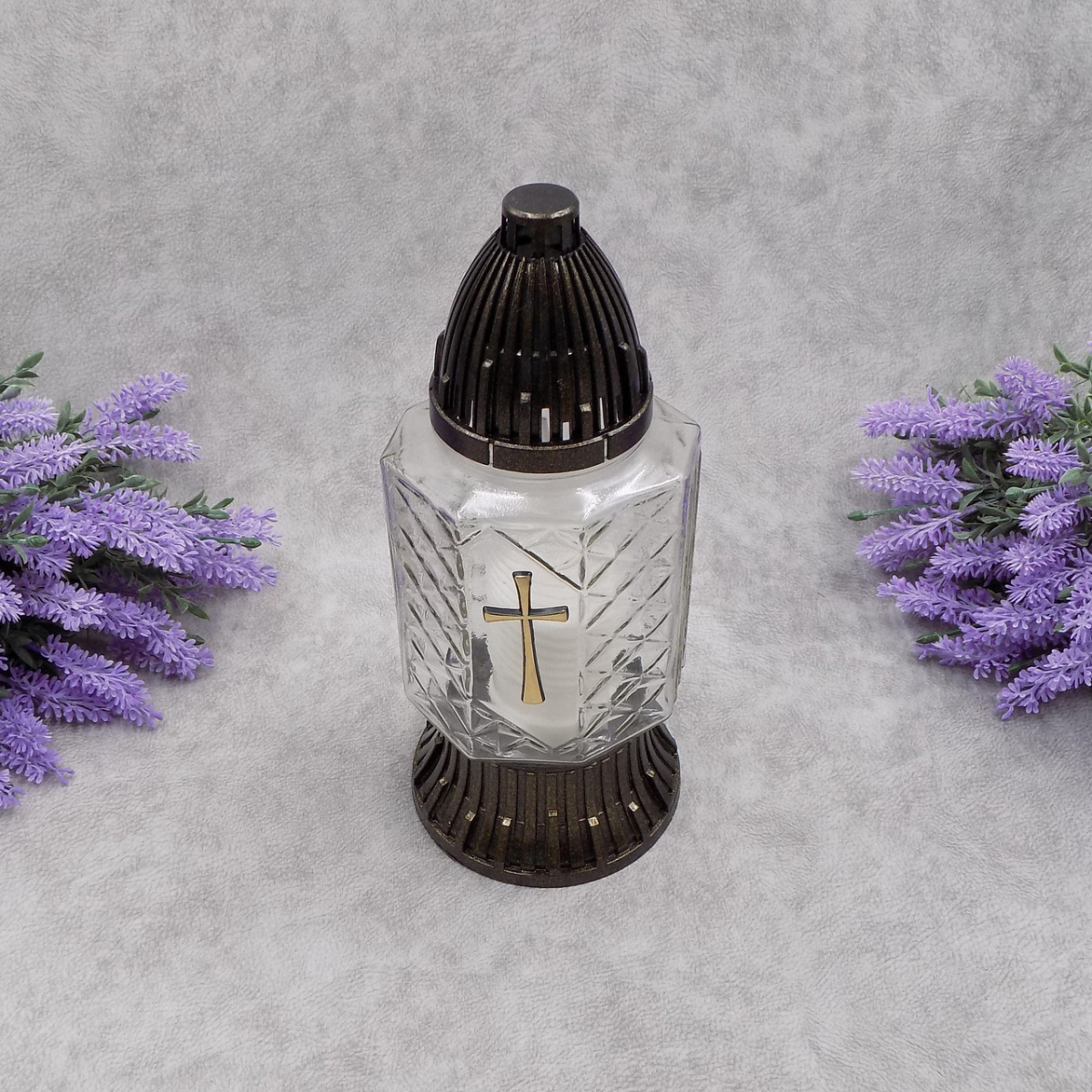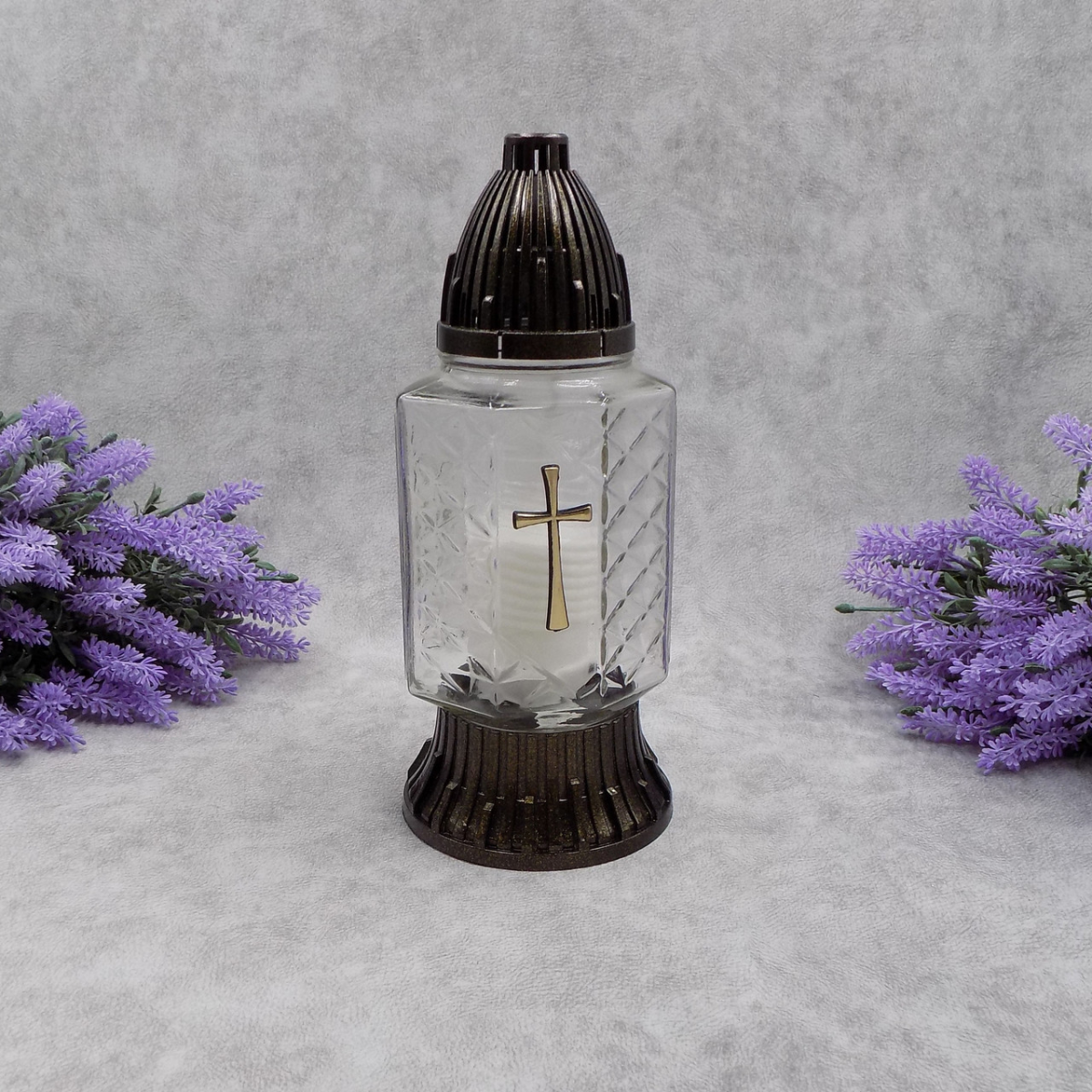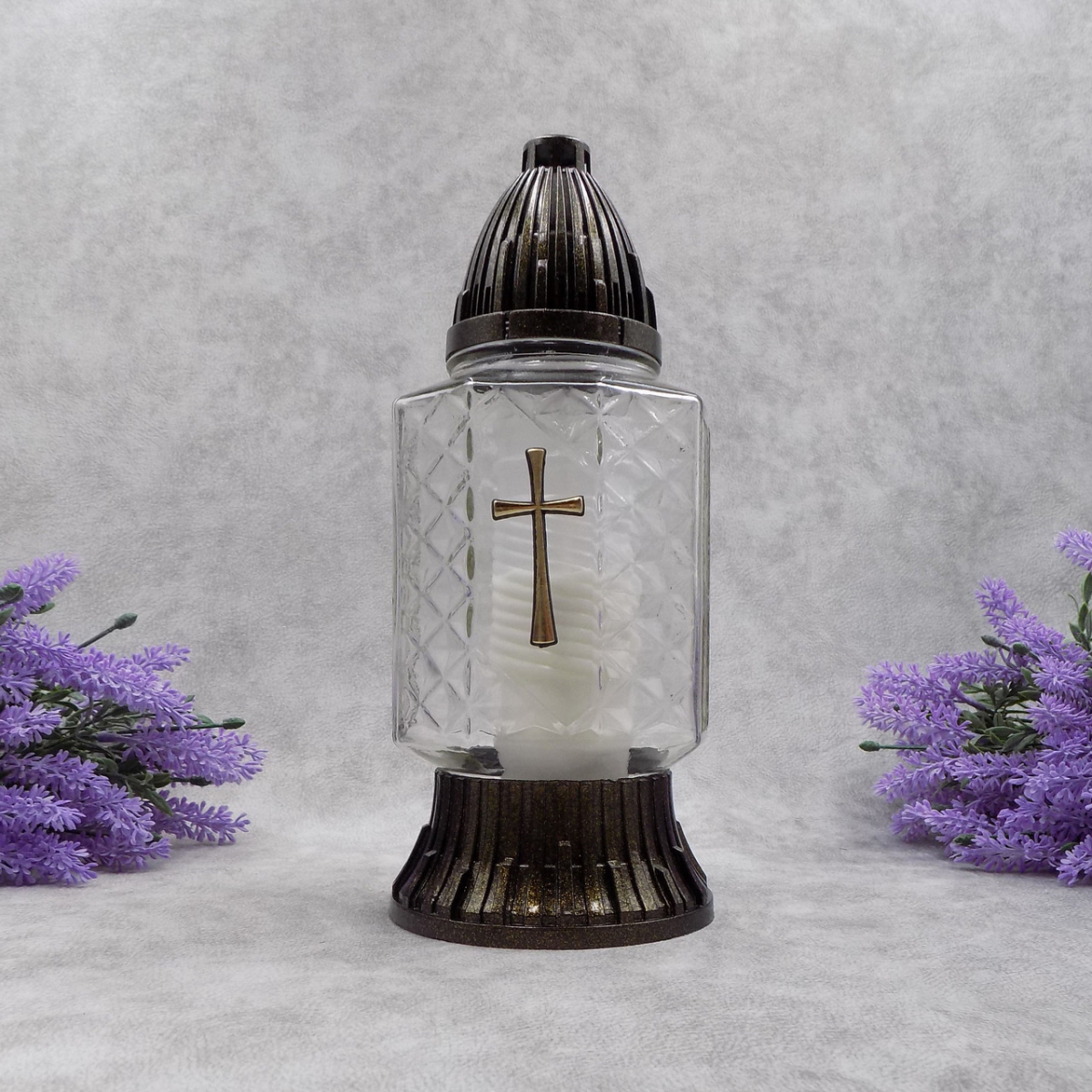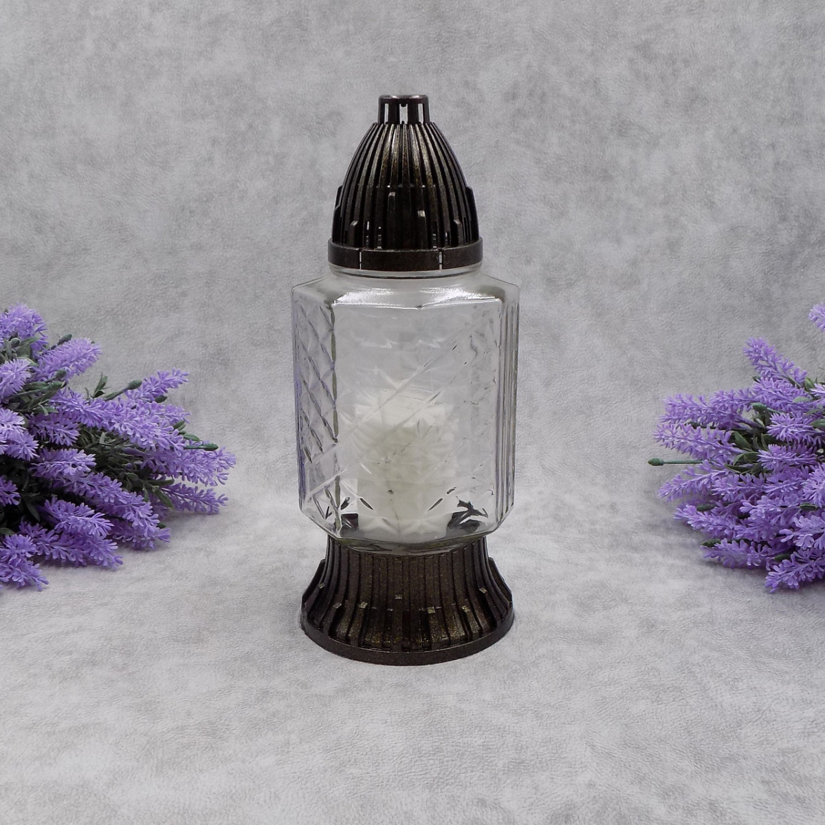 Лампадка зі свічкою-запаскою - виготовлена з високоякісних матеріалів, не містить токсичних речовин, не коптить і абсолютно безпечна для здоров“я. Матеріал: скло/пластик Час горіння свічки: ≈ 20 год Пакування: 8 шт Висота: 26 см Ширина: 11см Глибина: 10 см Вага: 0,5 кг Призначено для використання: цвинтар, пам“ятні заходи та меморіали тільки зовнішнє використання простота у використанні, можливість зміни свічки без зміни лампадки може використовуватися як зі свічками, так і з лампами LED стійка основа забезпечує розміщення на різних поверхнях і мінімізує можливість перекидання
