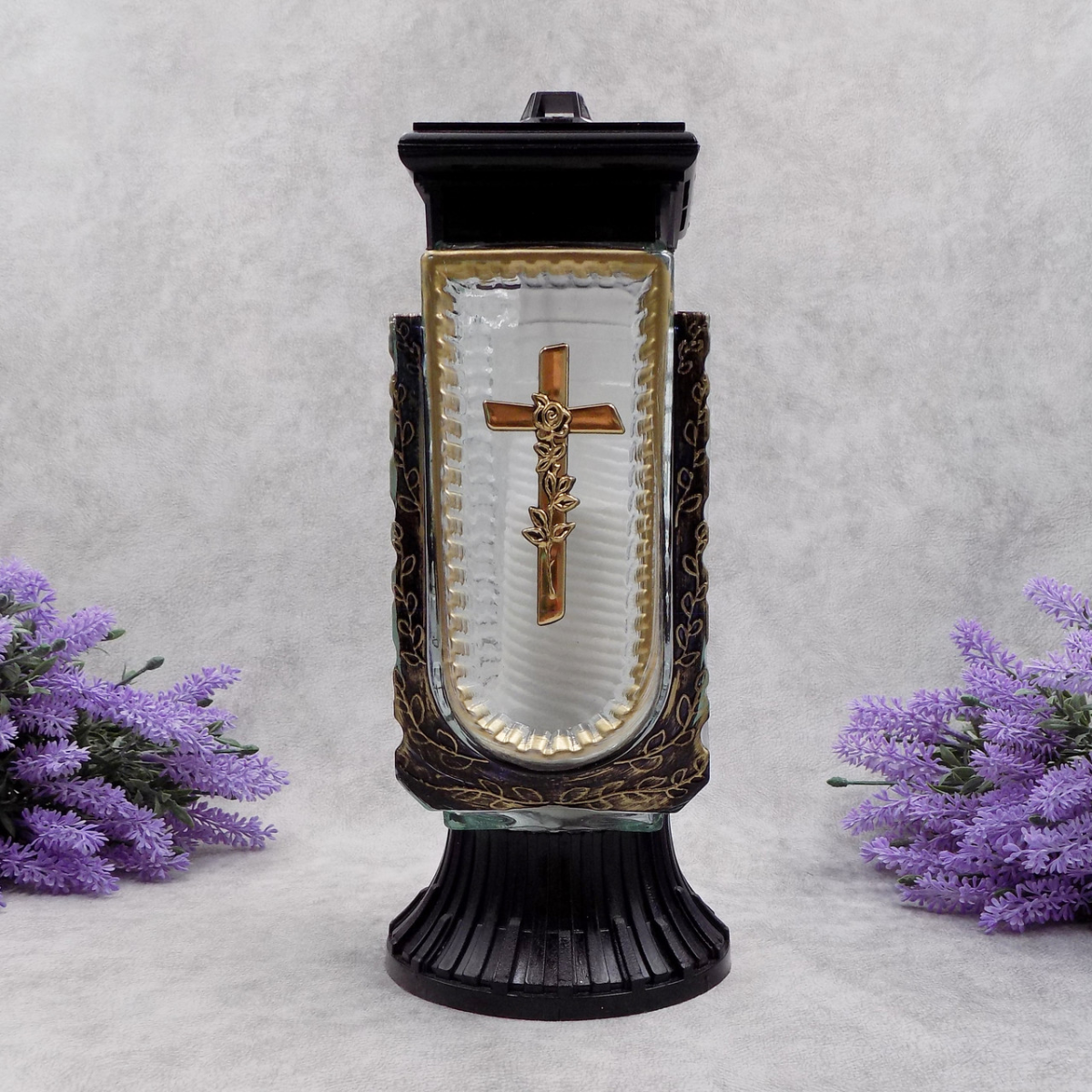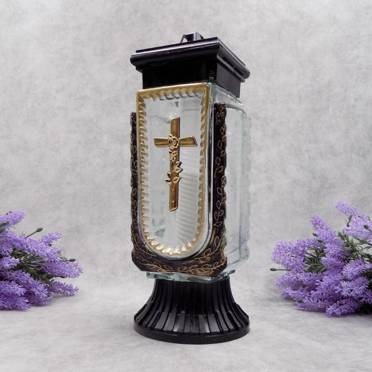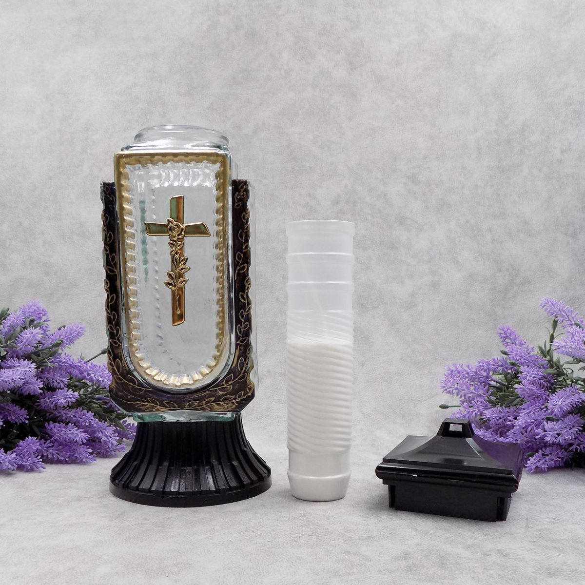 Лампадка зі свічкою-запаскою - виготовлена з високоякісних матеріалів, не містить токсичних речовин, не коптить і абсолютно безпечна для здоров“я. Матеріал: скло/пластик Час горіння свічки: ≈ 45 год Пакування: 6 шт Висота: 31 см Ширина: 13 см Глибина: 11 см Вага: 1,1 кг Призначено для використання: цвинтар, пам“ятні заходи та меморіали тільки зовнішнє використання простота у використанні, можливість зміни свічки без зміни лампадки може використовуватися як зі свічками, так і з лампами LED стійка основа забезпечує розміщення на різних поверхнях і мінімізує можливість перекидання