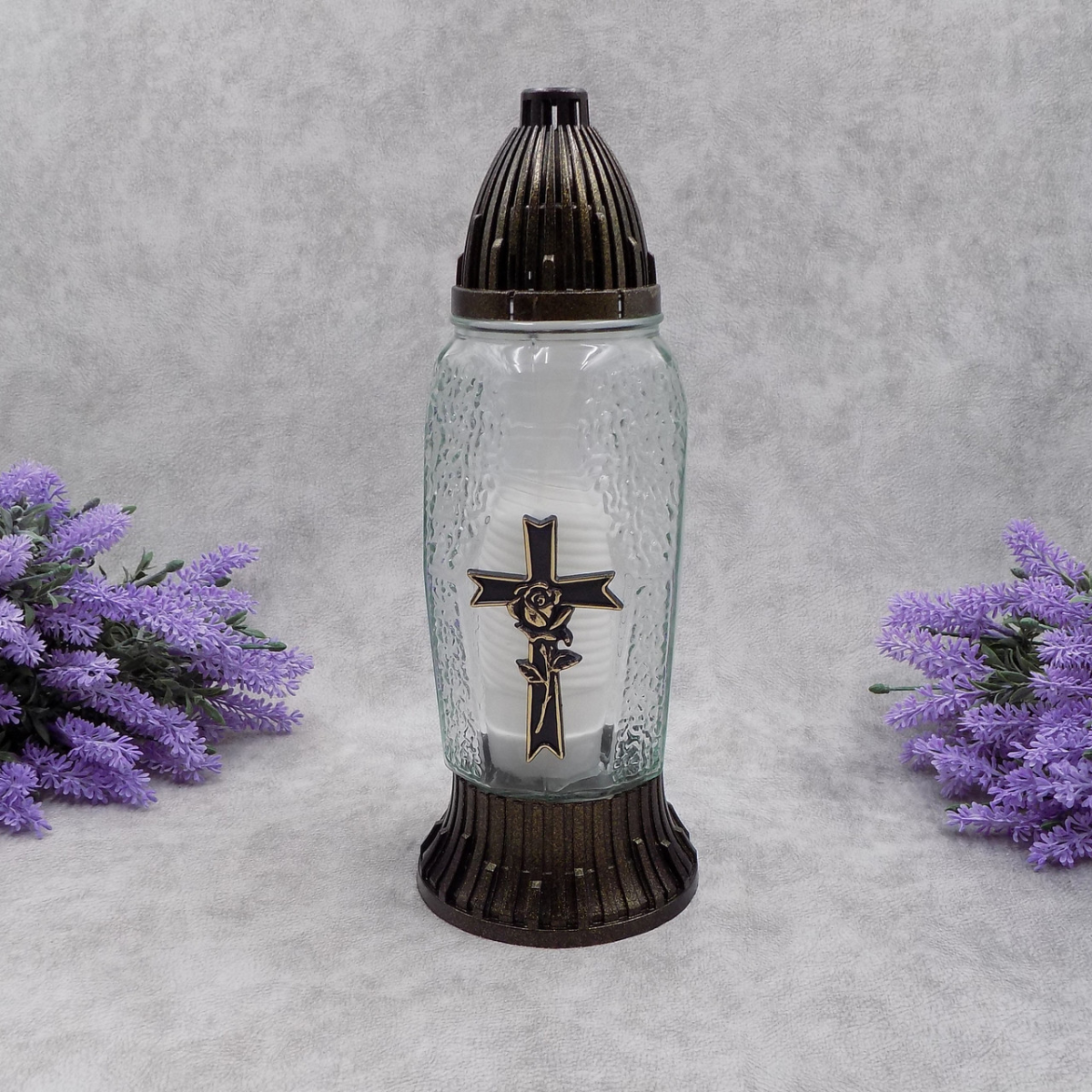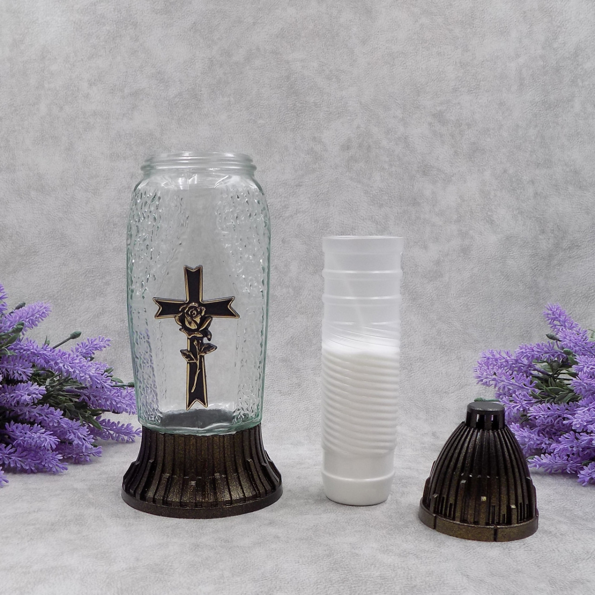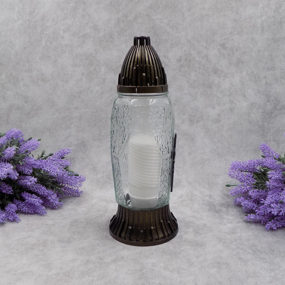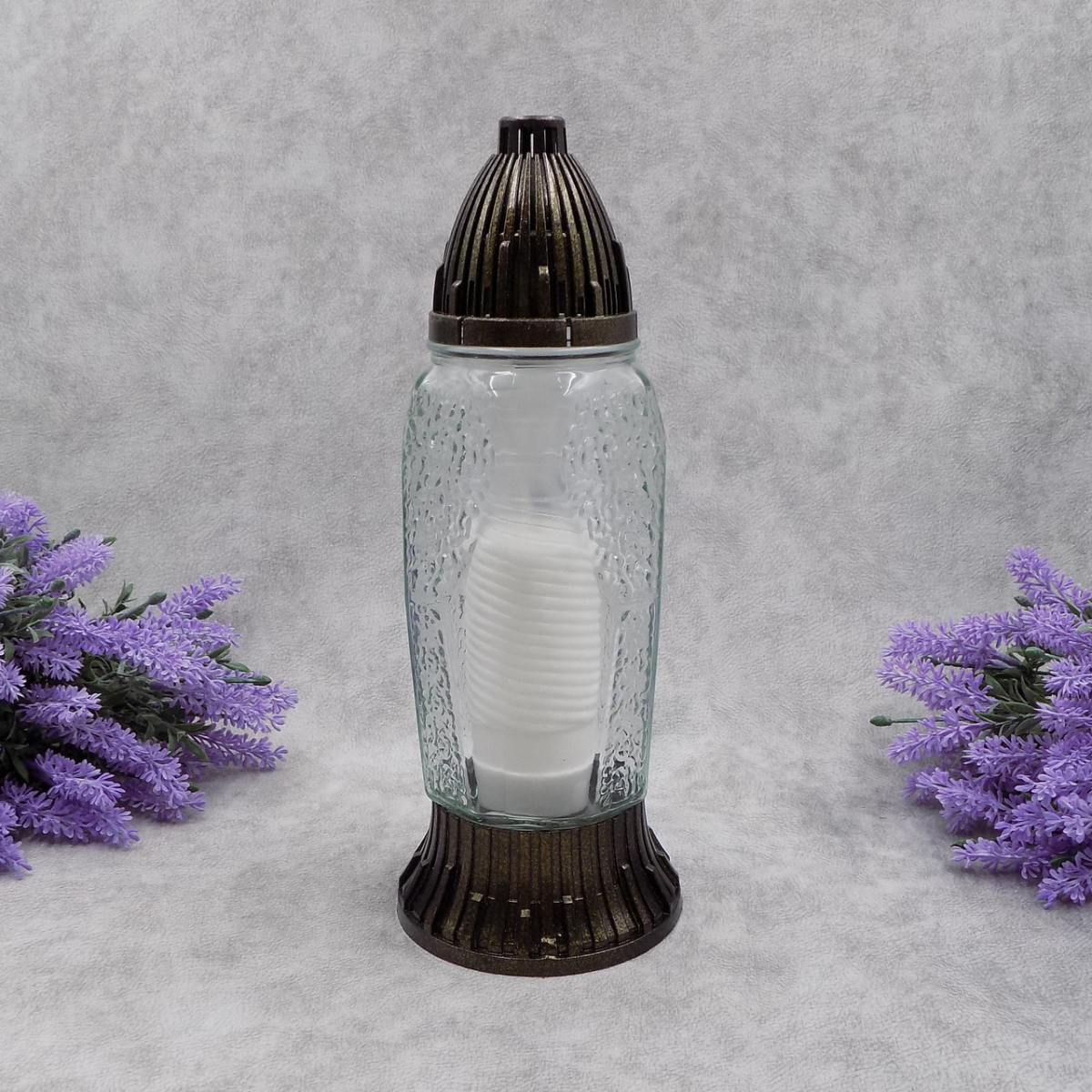 Лампадка зі свічкою-запаскою - виготовлена з високоякісних матеріалів, не містить токсичних речовин, не коптить і абсолютно безпечна для здоров“я. Матеріал: скло/пластик Час горіння свічки: ≈ 33 год Пакування: 8 шт Висота: 30 см Ширина: 12 см Глибина: 12 см Вага: 0,6 кг Призначено для використання: цвинтар, пам“ятні заходи та меморіали тільки зовнішнє використання простота у використанні, можливість зміни свічки без зміни лампадки може використовуватися як зі свічками, так і з лампами LED стійка основа забезпечує розміщення на різних поверхнях і мінімізує можливість перекидання