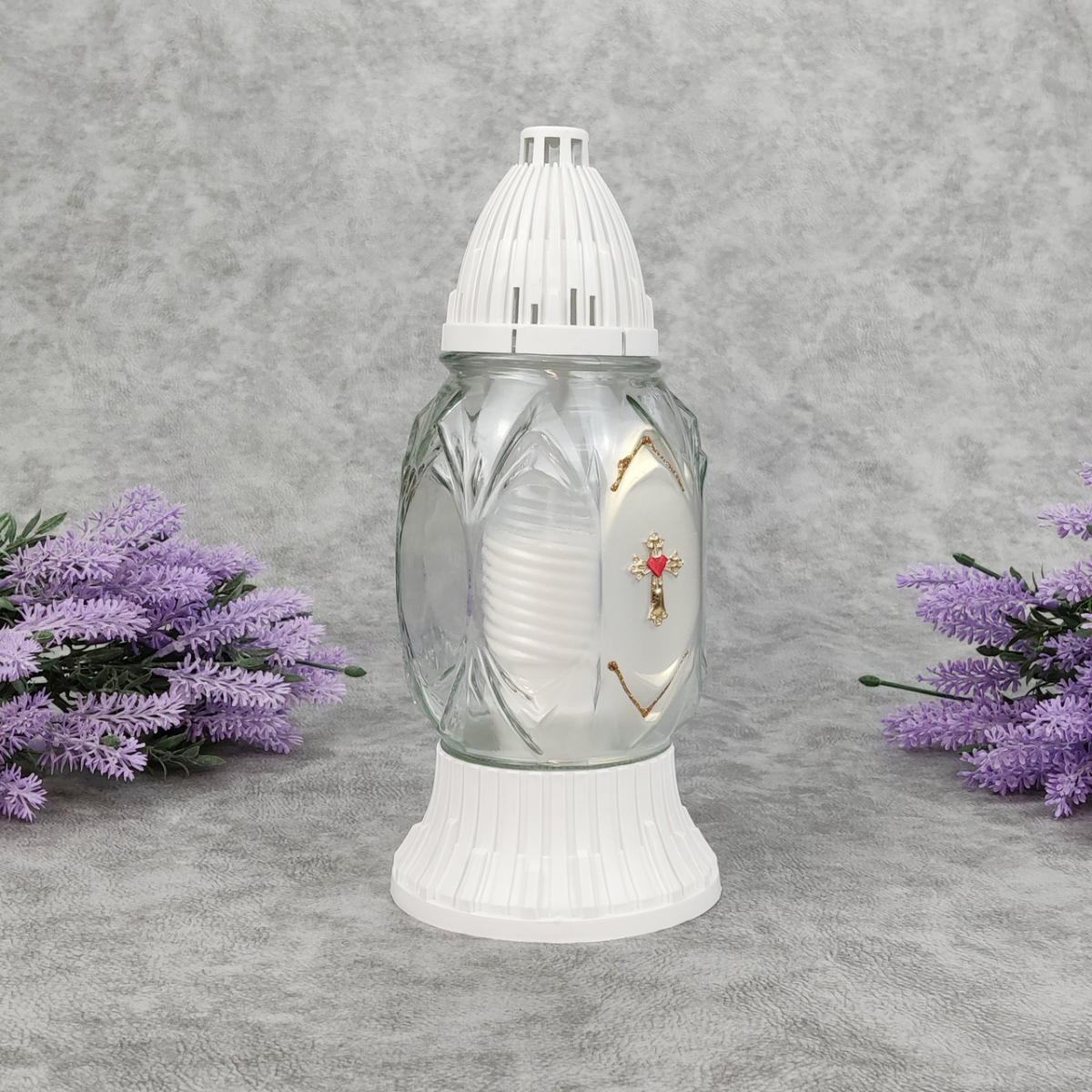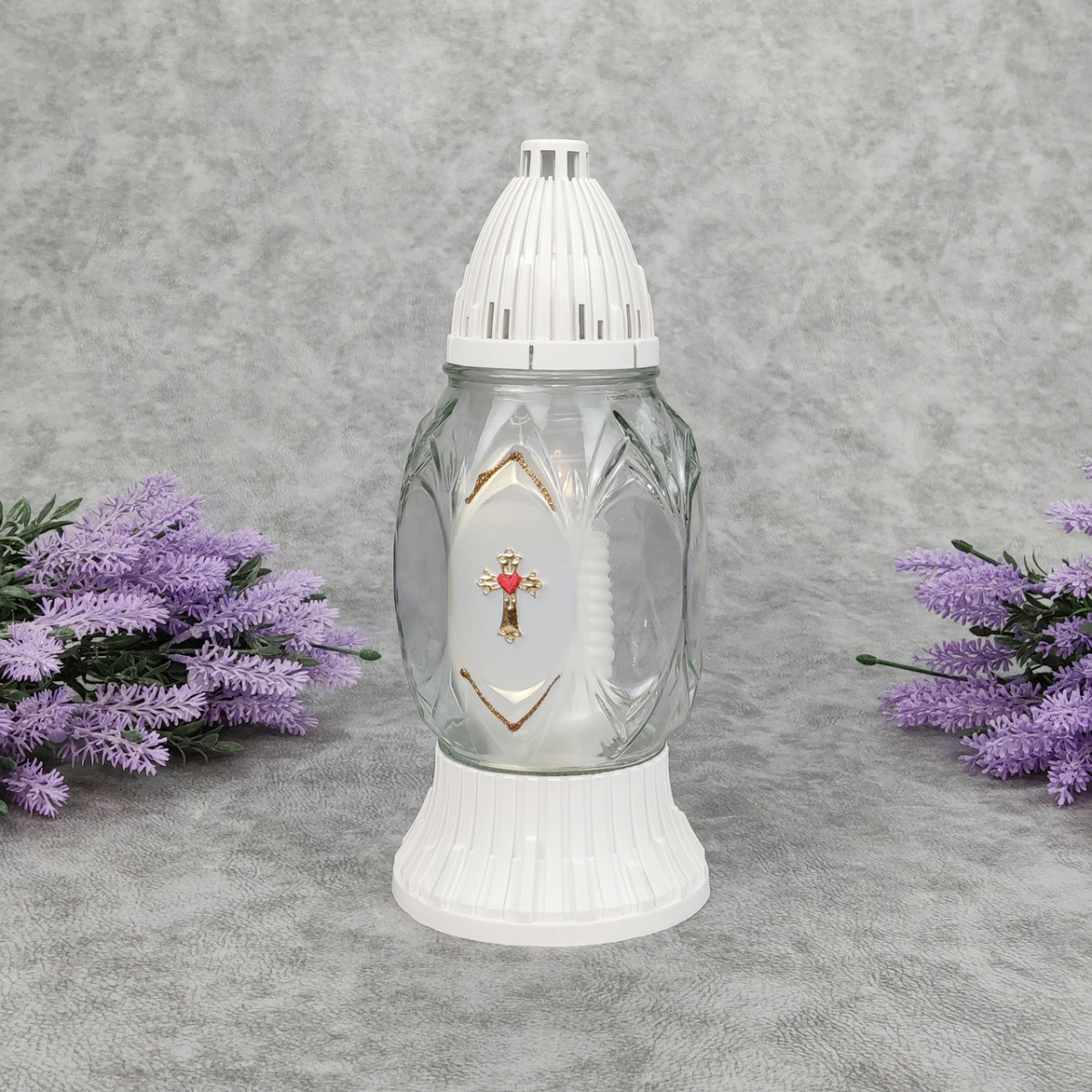 Лампадка - стриманий і символічний виріб, який запалюють на могилах померлих у пам’ять про померлих під час поминальних днів або особливих дат, що символізує незгасаючу пам’ять і молитовну підтримку душ. У християнстві лампадка є частиною як православних, так і католицьких традицій. Це простий, але виразний символ вічної шани до померлих, що втілює духовність і спокій. Матеріал: скло/пластик Час горіння свічки: ≈ 20 год Пакування: 8 шт Висота: 26 см Ширина: 11 см Глибина: 11 см Вага: 0,5 кг Призначено для використання: цвинтар, пам“ятні заходи та меморіали тільки зовнішнє використання простота у використанні, можливість зміни свічки без зміни лампадки може використовуватися як зі свічками, так і з лампами LED стійка основа забезпечує розміщення на різних поверхнях і мінімізує можливість перекидання