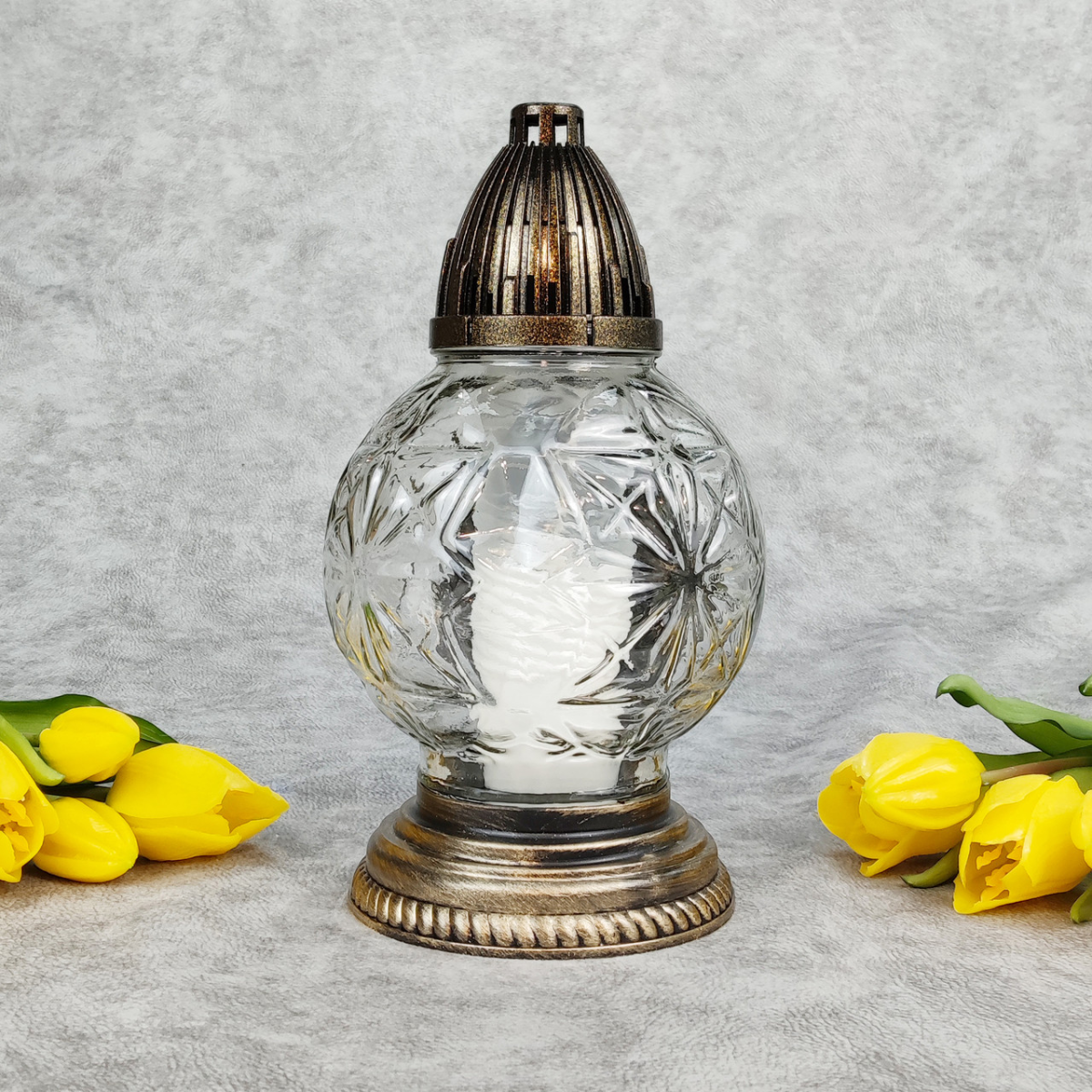 Лампадка зі свічкою-запаскою - виготовлена з високоякісних матеріалів, не містить токсичних речовин, не коптить і абсолютно безпечна для здоров“я. Матеріал: скло/пластик Час горіння свічки: ≈ 20 годин Пакування: 5 штук Висота: 26 см Ширина: 13 см Глибина: 13 см Вага: 0,5 кг Призначено для використання: цвинтар, пам“ятні заходи та меморіали тільки зовнішнє використання простота у використанні, можливість зміни свічки без зміни лампадки може використовуватися як зі свічками, так і з лампами LED стійка основа забезпечує розміщення на різних поверхнях і мінімізує можливість перекидання