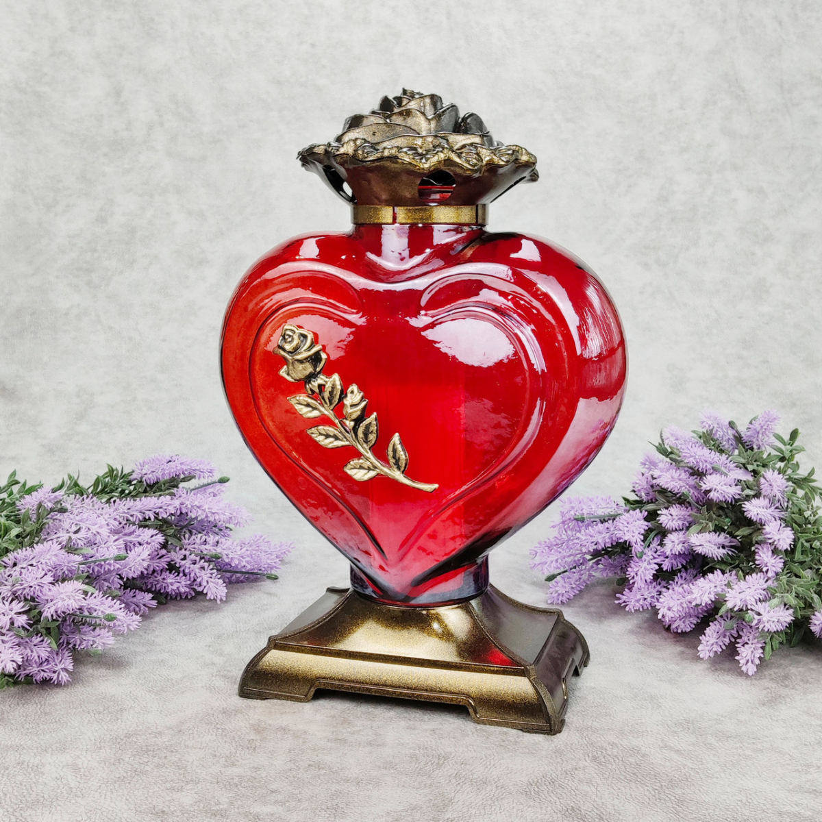 Лампадка скляна велика серце червона з золотистою трояндою Serce Ornament 45год